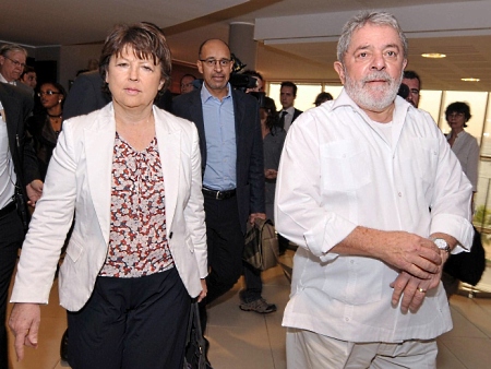 Ex-presidente Luiz Inácio Lula da Silva e a primeira secretária do Partido Socialista francês, Martine Aubry, conversam durante o Fórum Social Mundial |
