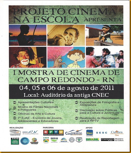 O projeto Cinema na Escola apresenta a I Mostra de Cinema de Campo Redondo, nos dias 04, 05 e 06 de agosto de 2011. O evento será realizado no auditório da antiga CNEC.
